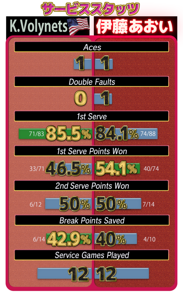 伊藤はファーストサーブ確率が80%超え。一時期のサービスの不調から脱出した姿を見せた。