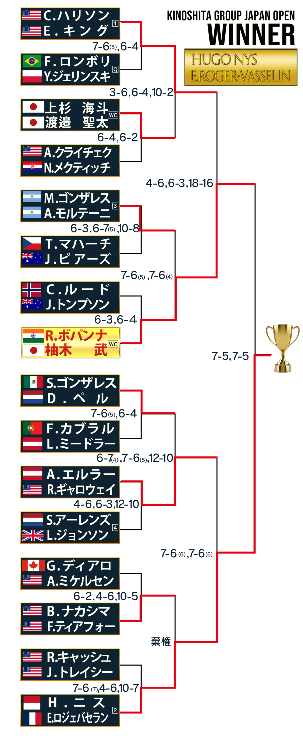 世界ダブルスランク20位のヒューゴ・ニス(34歳=モナコ)と同18位のエドゥアール・ロジェバセラン(41歳=フランス)組と対戦は、7-5,7-5のスコアで、ニス&ロジェバセラン組が勝利した。
