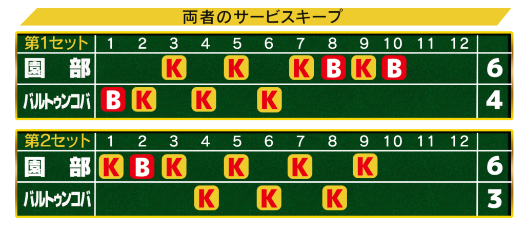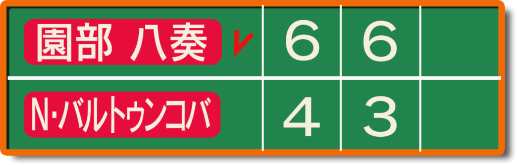 序盤は第1ゲームのサービスゲームを落とすなど、園部の完全な劣勢だった。