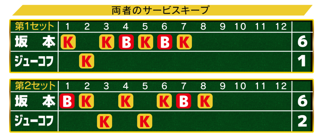 この日は坂本のリターンも良かったが、安定した試合を可能にしているのは、相手ブレークポイントにも動じない、その圧倒的なサーブ力だ。