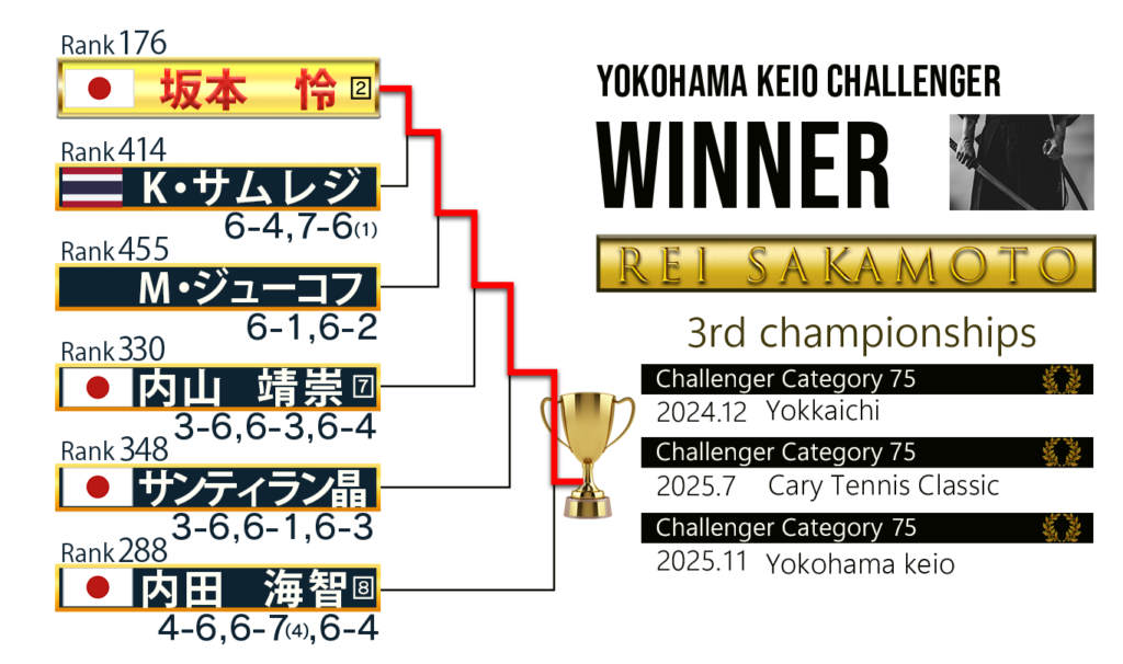 世界ランク176位で大会第2シードの坂本怜(19歳)が11月23日、横浜慶應チャレンジャー決勝に臨み、世界ランク288位で第8シードの内田海智(31歳)と対戦。4-6,7-6(4),6-4で逆転勝利した。試合時間2時間15分。