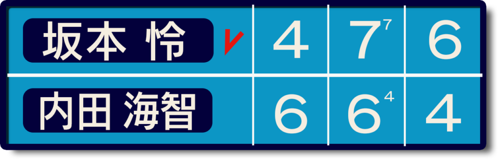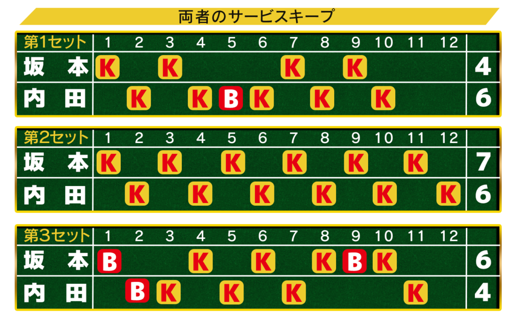 両者キープが続いたが、内田は被ブレークポイント0に対して、坂本は5度。