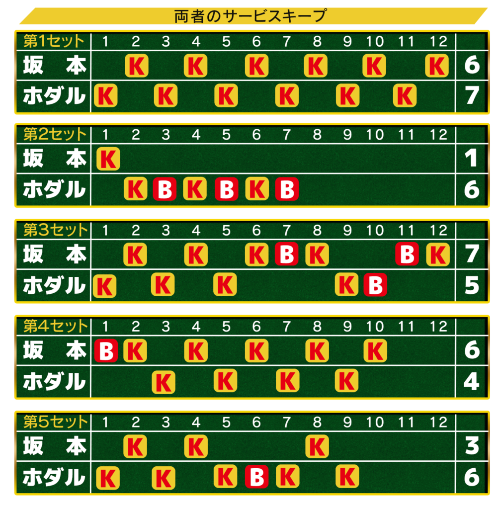 対して坂本はブレークされたゲーム以外のすべてをラブゲームキープ。