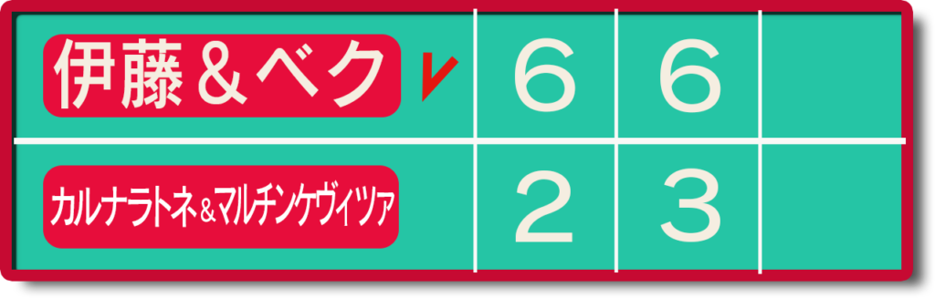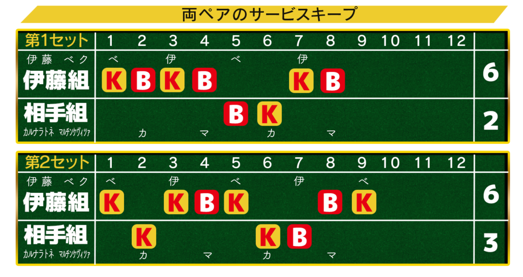 自らのサービスは4度機会があり3度キープ。1回はラブゲームでブレークを許したが、パートナーとのコンビネーションが乱れたのと、相手の好プレーによるもの。
